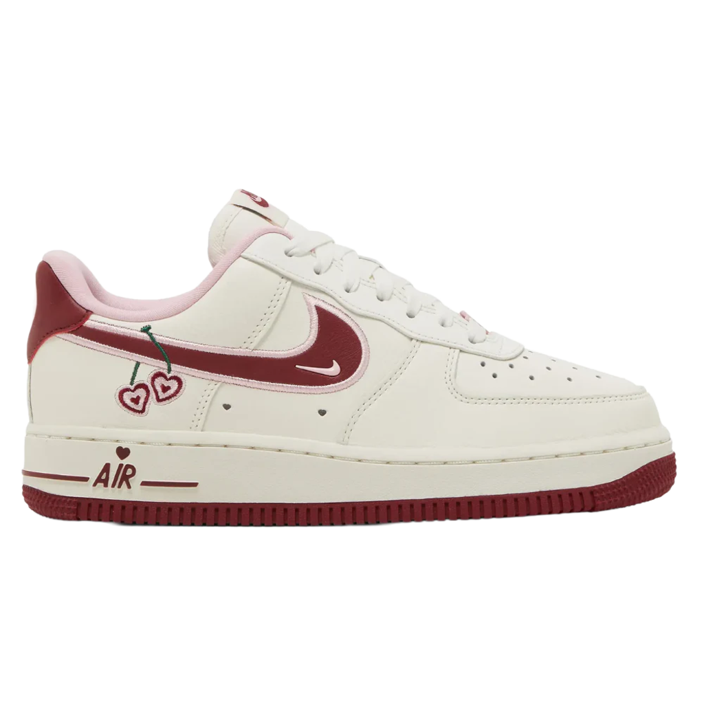 The Nike Women’s Air Force 1 Low ‘Valentine’s Day 2023’ showcases fitting colors and design flourishes in honor of the February 14 holiday. The low-top sports an off-white leather upper with a maroon Swoosh outlined in pink embroidery. A pair of heart-shaped cherries are suspended from the Swoosh by their green stems, while additional heart motifs decorate the heel tab and lace dubrae. The sneaker rests on a durable rubber cupsole, featuring off-white sidewalls, encapsulated Air-sole cushioning, and a burgundy outsole.
