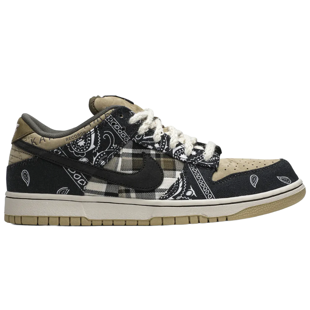Made in collaboration with the Astroworld rapper, the Travis Scott x SB Dunk Low PRM QS 'Cactus Jack' Special Box treats the retro low-top to a radical design overhaul. The upper features a brown suede toe box, tartan plaid textile quarter panel and tear-away paisley textile on the forefoot and heel overlay. Braided rope laces give the sneaker a distinctly rustic look. This pair arrives in a special Nike SB box finished in the same plaid and paisley patterns found on the shoe.